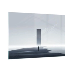 Glasbild - Bild auf glas - Eine minimalistische Landschaft mit einer Figur und einem Monolithen in der Ferne. - 100x70cm - Chance oder Bedrohung? - Moderne Wanddekoration für Wohnzimmer und Schlafzimmer ARTTOR