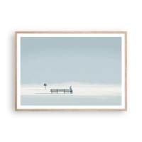 Poster in einem schwarzem Rahmen - Eine Person, die auf einer Bank in einer minimalistischen Landschaft sitzt - 100x70cm - Ja, ich warte. - Moderne Wanddekoration für Wohnzimmer und Schlafzimmer ARTTOR
