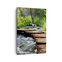 Bild auf Leinwand - Leinwandbild - Eine Holzbrücke über einen rauschenden Bach, umgeben vom Grün des Waldes. - 70x100cm - Über der schaumigen Kaskade - Moderne Wanddekoration für Wohnzimmer und Schlafzimmer ARTTOR