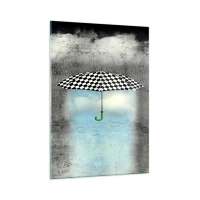 Glasbild - Bild auf glas - Ein schwarz-weiß karierter Regenschirm vor einem Hintergrund aus Regen und Wolken - 50x70cm - Aber möglich - Moderne Wanddekoration für Wohnzimmer und Schlafzimmer ARTTOR