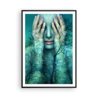 Glasbild - Bild auf glas - Eine Frauenfigur mit Baummotiv vor türkisfarbenem Landschaftshintergrund - 70x100cm - Eingetaucht in Blau - Moderne Wanddekoration für Wohnzimmer und Schlafzimmer ARTTOR