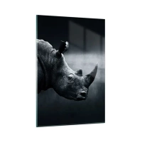 Glasbild - Bild auf glas - Schwarz-Weiß-Porträt eines Nashorns vor dunklem Hintergrund - 80x120cm - Richtiges Profil - Moderne Wanddekoration für Wohnzimmer und Schlafzimmer ARTTOR