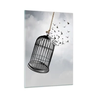 Glasbild - Bild auf glas - Die Öffnung des Käfigs und die Vögel, die aus ihm herausfliegen, gegen den Himmel - 50x70cm - Glaube ... Hoffnung ... Freiheit! - Moderne Wanddekoration für Wohnzimmer und Schlafzimmer ARTTOR