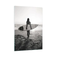 Glasbild - Bild auf glas - Frau mit Surfbrett am Strand in Schwarz und Weiß - 80x120cm - Die Tochter der Meereswelle - Moderne Wanddekoration für Wohnzimmer und Schlafzimmer ARTTOR