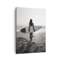 Bild auf Leinwand - Leinwandbild - Frau mit Surfbrett am Strand in Schwarz und Weiß - 80x120cm - Die Tochter der Meereswelle - Moderne Wanddekoration für Wohnzimmer und Schlafzimmer ARTTOR