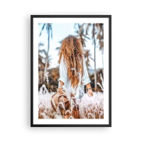 Poster in einem schwarzem Rahmen - Eine Frau in einem weißen Hemd geht zwischen Palmen spazieren - 50x70cm - Geboren aus Grasflaum - Moderne Wanddekoration für Wohnzimmer und Schlafzimmer ARTTOR