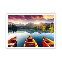 Poster - Drei Holzboote vor der Kulisse eines Bergsees bei Sonnenuntergang - 100x70cm - Nichts gegen die Natur - Moderne Wanddekoration für Wohnzimmer und Schlafzimmer ARTTOR