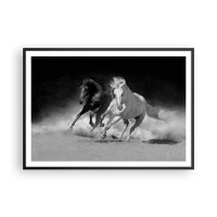 Poster in einem schwarzem Rahmen - Laufende Pferde in Schwarz und Weiß - 100x70cm - Galopp der Freiheit - Moderne Wanddekoration für Wohnzimmer und Schlafzimmer ARTTOR
