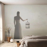 Maßgeschneiderte Fototapete Premium Sand - Sei frei - Frau, Vogelkäfig, Vogel