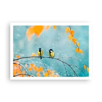 Poster - Zwei Vögel auf einem Ast in einer Winterlandschaft mit gelben Blättern. - 100x70cm - Vogelklatsch - Moderne Wanddekoration für Wohnzimmer und Schlafzimmer ARTTOR