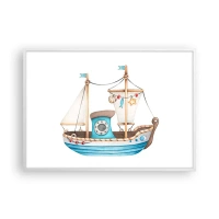 Poster in einem schwarzem Rahmen - Abbildung eines Schiffes in Pastellfarben auf weißem Hintergrund - 100x70cm - Ahoi, Abenteuer! - Moderne Wanddekoration für Wohnzimmer und Schlafzimmer ARTTOR