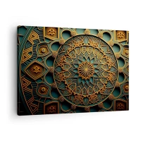 Fototapete Premium Canvas - Ein goldenes Mandala auf türkisfarbenem Hintergrund mit vielen Details. - 100x70cm - In arabischer Atmosphäre - Moderne Wanddekoration für Wohnzimmer und Schlafzimmer ARTTOR