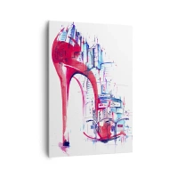 Bild auf Leinwand - Leinwandbild - Abstrakter roter Stilettoabsatz mit urbanen Details - 70x100cm - Ein Großstadt-Dandy - Moderne Wanddekoration für Wohnzimmer und Schlafzimmer ARTTOR