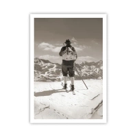 Bild auf Leinwand - Leinwandbild - Ein Skifahrer auf einem Berggipfel in Schwarz und Weiß - 70x100cm - Und die Berge bleiben unverändert - Moderne Wanddekoration für Wohnzimmer und Schlafzimmer ARTTOR