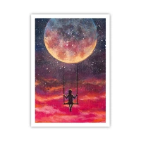 Bild auf Leinwand - Leinwandbild - Eine Figur auf einer Schaukel, die vor dem Mond hängt - 70x100cm - Traum - Moderne Wanddekoration für Wohnzimmer und Schlafzimmer ARTTOR