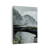 Bild auf Leinwand - Leinwandbild - Ein Steinbogen, umgeben von nebligen Bergen und Wäldern - 50x70cm - Abenteuer beginnt gleich - Moderne Wanddekoration für Wohnzimmer und Schlafzimmer ARTTOR