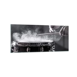 Glasbild - Bild auf glas - Schlagen der Snare Drum mit Sticks mit Staubeffekt - 120x50cm - Der Puls der Musik - Moderne Wanddekoration für Wohnzimmer und Schlafzimmer ARTTOR