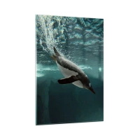 Glasbild - Bild auf glas - Ein Pinguin taucht in die Tiefen des eisigen Wassers - 80x120cm - Willkommen in meiner Welt - Moderne Wanddekoration für Wohnzimmer und Schlafzimmer ARTTOR