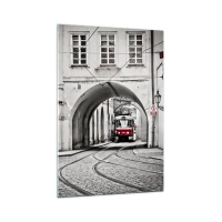 Glasbild - Bild auf glas - Eine schwarz-weiße Straßenbahn in einer historischen Stadtstraße - 80x120cm - Durch das Stadtlabyrinth - Moderne Wanddekoration für Wohnzimmer und Schlafzimmer ARTTOR