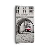 Bild auf Leinwand - Leinwandbild - Eine schwarz-weiße Straßenbahn in einer historischen Stadtstraße - 80x120cm - Durch das Stadtlabyrinth - Moderne Wanddekoration für Wohnzimmer und Schlafzimmer ARTTOR