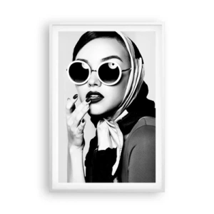 Glasbild - Bild auf glas - Schwarz-Weiß-Porträt einer Frau mit Brille und Kopftuch - 80x120cm - Grüße aus den 1960er Jahren - Moderne Wanddekoration für Wohnzimmer und Schlafzimmer ARTTOR