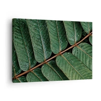 Bild auf Leinwand - Leinwandbild - Makroaufnahme von grünen Blättern mit Tautropfen - 70x50cm - Im grünen Rhythmus - Moderne Wanddekoration für Wohnzimmer und Schlafzimmer ARTTOR