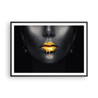 Poster in einem schwarzem Rahmen - Schwarz-goldenes Porträt einer Frau mit einem Tropfen Gold auf den Lippen - 100x70cm - Goldmaul - Moderne Wanddekoration für Wohnzimmer und Schlafzimmer ARTTOR