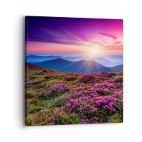 Bild auf Leinwand - Leinwandbild - Bergwiese mit Blumen bei Sonnenuntergang - 70x50cm - Kräuter dufteten nach frischen Trauben von den Feldern - Moderne Wanddekoration für Wohnzimmer und Schlafzimmer ARTTOR