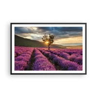 Poster in einem schwarzem Rahmen - Ein Lavendelfeld mit einem einsamen Baum bei Sonnenuntergang - 100x70cm - Fliederfarbenes Aroma - Moderne Wanddekoration für Wohnzimmer und Schlafzimmer ARTTOR