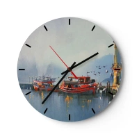 Glasbild - Bild auf glas - Ein Hafen mit roten Booten, umgeben von einer nebligen Landschaft - 80x120cm - Am Ende der Welt - Moderne Wanddekoration für Wohnzimmer und Schlafzimmer ARTTOR