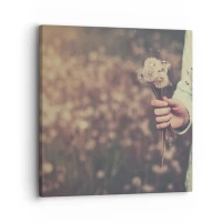 Bild auf Leinwand - Leinwandbild - Eine Hand hält Löwenzahn vor dem unscharfen Hintergrund eines Feldes voller Blumen. - 120x80cm - Bitte behalte sie - Moderne Wanddekoration für Wohnzimmer und Schlafzimmer ARTTOR