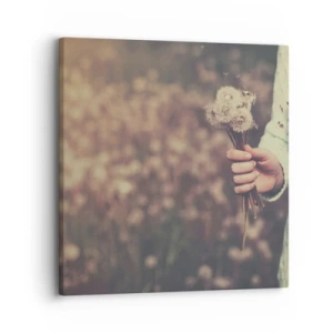 Bild auf Leinwand - Leinwandbild - Eine Hand hält Löwenzahn vor dem unscharfen Hintergrund eines Feldes voller Blumen. - 100x70cm - Bitte behalte sie - Moderne Wanddekoration für Wohnzimmer und Schlafzimmer ARTTOR