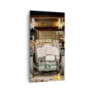Glasbild - Bild auf glas - Ein altes Auto in einer Garage, umgeben von Werkzeugen und Geräten - 80x120cm - Zurück in die Vergangenheit - Moderne Wanddekoration für Wohnzimmer und Schlafzimmer ARTTOR
