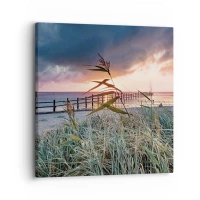 Bild auf Leinwand - Leinwandbild - Strand bei Sonnenuntergang mit Gräsern im Vordergrund - 50x70cm - Es vergeht nicht mit dem Wind - Moderne Wanddekoration für Wohnzimmer und Schlafzimmer ARTTOR