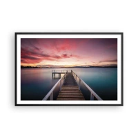 Poster in einem schwarzem Rahmen - Ein Steg, der bei Sonnenuntergang zu einem ruhigen See führt - 100x70cm - Die sanfte Flamme des Abends - Moderne Wanddekoration für Wohnzimmer und Schlafzimmer ARTTOR
