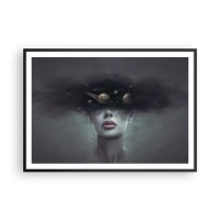 Poster in einem schwarzem Rahmen - Ein Frauengesicht mit einem Planeten- und Weltraummotiv im Hintergrund - 100x70cm - Und die Planeten spielen verrückt ... - Moderne Wanddekoration für Wohnzimmer und Schlafzimmer ARTTOR