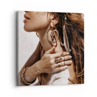 Bild auf Leinwand - Leinwandbild - Stilvolle Frau mit Schmuck vor hellem Sandhintergrund - 70x100cm - Königin des wilden Strandes - Moderne Wanddekoration für Wohnzimmer und Schlafzimmer ARTTOR