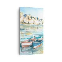 Bild auf Leinwand - Leinwandbild - Eine malerische Küstenlandschaft mit Booten auf dem Wasser - 100x70cm - Landschaft in Azurblau - Moderne Wanddekoration für Wohnzimmer und Schlafzimmer ARTTOR