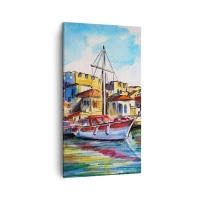 Bild auf Leinwand - Leinwandbild - Ein malerischer Hafen mit einem Boot und farbenfrohen Gebäuden - 120x80cm - Regenbogennachmittag - Moderne Wanddekoration für Wohnzimmer und Schlafzimmer ARTTOR