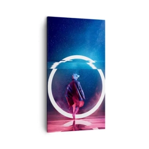 Bild auf Leinwand - Leinwandbild - Eine Figur in einer futuristischen Umgebung mit einem Neonkreis - 160x50cm - Zwischen den Welten - Moderne Wanddekoration für Wohnzimmer und Schlafzimmer ARTTOR