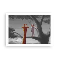 Poster - Ein Kind und eine Giraffe auf einem Ast in einer Märchenlandschaft - 100x70cm - Das passiert wirklich - Moderne Wanddekoration für Wohnzimmer und Schlafzimmer ARTTOR