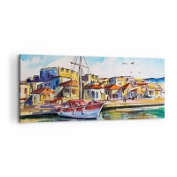 Bild auf Leinwand - Leinwandbild - Eine malerische Küstenlandschaft mit Booten auf dem Wasser - 120x50cm - Landschaft in Azurblau - Moderne Wanddekoration für Wohnzimmer und Schlafzimmer ARTTOR