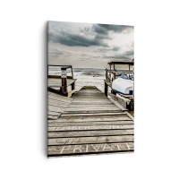 Bild auf Leinwand - Leinwandbild - Ein Boot am Strand mit türkisfarbenem Meer im Hintergrund - 50x70cm - An seinem Platz - Moderne Wanddekoration für Wohnzimmer und Schlafzimmer ARTTOR
